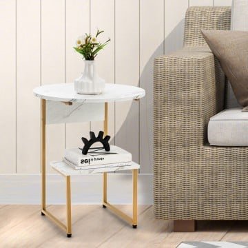 Faux Marble End Table with Round Tabletop and Square Shelf